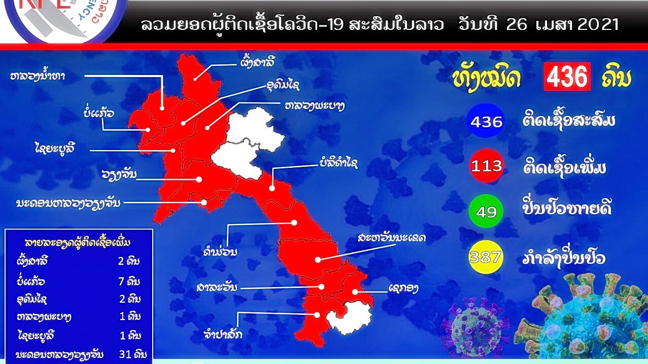 สถิติใหม่โควิดลาว – เมื่อวันที่ 26 เม.ย. สำนักข่าวสารประเทศลาว รายงานพบผู้ติดเชื้อโควิด-19 เพิ่มอีก 113 คน นับเป็นจำนวนผู้ติดเชื้อภายในวันเดียวมากที่สุด นับตั้งแต่มีการแพร่ระบาดของเชื้อโควิดในลาว รวมยอดผู้ติดเชื้อสะสม 436 คน รักษาหายแล้ว 49 คน ยังรักษาอยู่ในโรงพยาบาล 387 คน